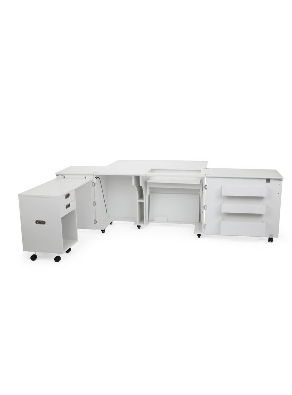 Costway White Folding Sewing Craft Table With Storage Shelves Cabinet Lockable Wheels Walmart Com